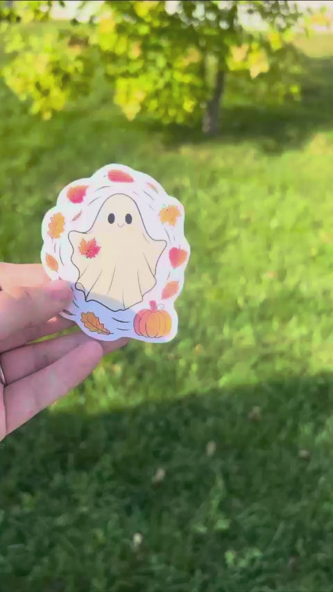 Bring cozy fall vibes and spooky charm to your collection with this Ghost Leaf vinyl sticker! 👻🍁 Surrounded by autumn leaves and pumpkins, this little ghost is ready for sweater weather and Halloween fun.